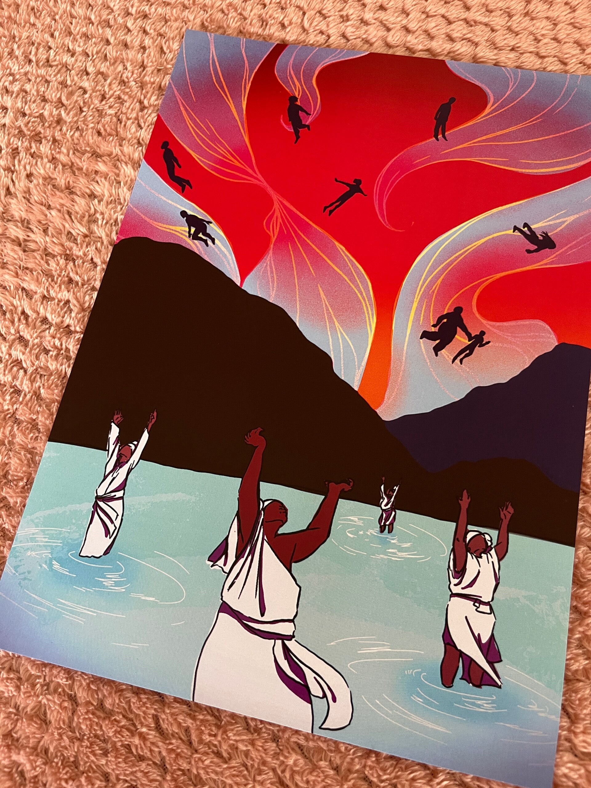 The 'Bulabanda' print is based on Clarice Gargard's 2022 documentary about Black resistance. Bulabanda is a place in Curaçao where, according to stories, enslaved people who had not eaten any salt went and flew back to their country of birth in Africa.