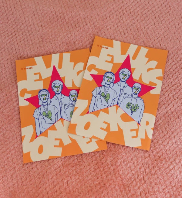 Gelukszoeker is a Dutch word that is often used in a derogatory sense for refugees who, according to the people using it, don't deserve asylum, because they're simply "seeking good fortune" (geluk zoeken). The word 'geluk' means both 'luck' and 'happiness', depending on the context. The text on the print says "I, too, am a gelukszoeker".